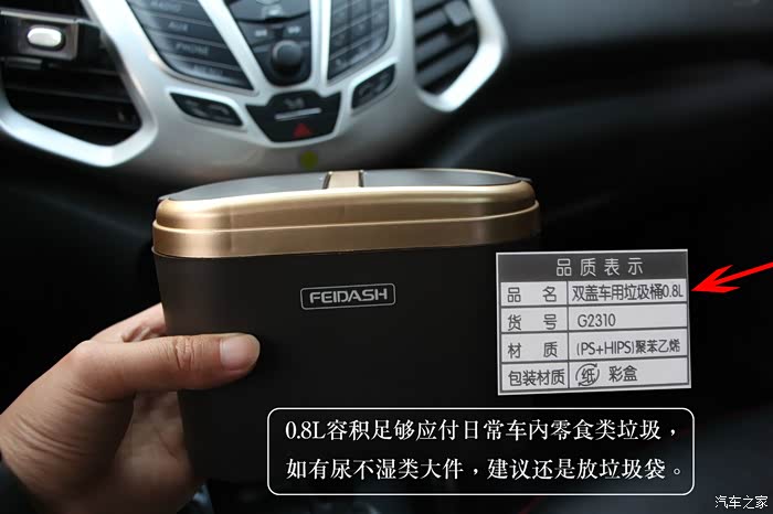 垃圾桶标称容积0.8L,实际应用中,只能应付零食类、餐巾纸等小垃圾物件,对于大的比如尿不湿等,建议还是停车扔路边垃圾桶,或者高速路上去服务区处理。