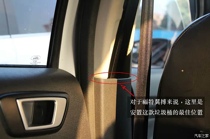一开始还以为这款垃圾桶没地方放置了,有点失望。不过耐心研究,总会有意外的惊喜。很快我就发现了翼搏两根B柱内侧安全带抽出口是个不错的位置。