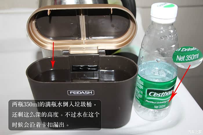 两瓶350ML的矿泉水瓶,总共是700ml灌满自来水,倒进垃圾桶内,还有这么多没满,说明800ML的容量确实是标足了的。这点值得称赞。