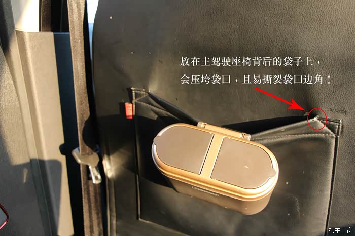 因为车内主要是儿子吃东西要扔垃圾,所以这款垃圾桶我选择放在后排座使用。不过,放置的位置确实让我摸索了一会儿。比如这样,空盒子直接压垮皮袋子。