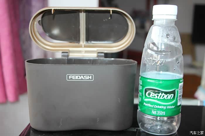 最后,对比一下我去年买的这个垃圾桶,杯状的,只能放置在中央通道的水杯位置,占用一个杯位,很不爽哦!而且这个摇摇晃晃的盖子,噪音非常大!当然,两款垃圾桶盖子都有噪音!