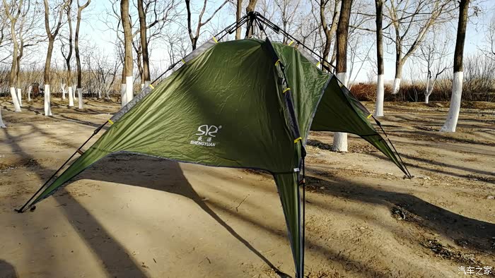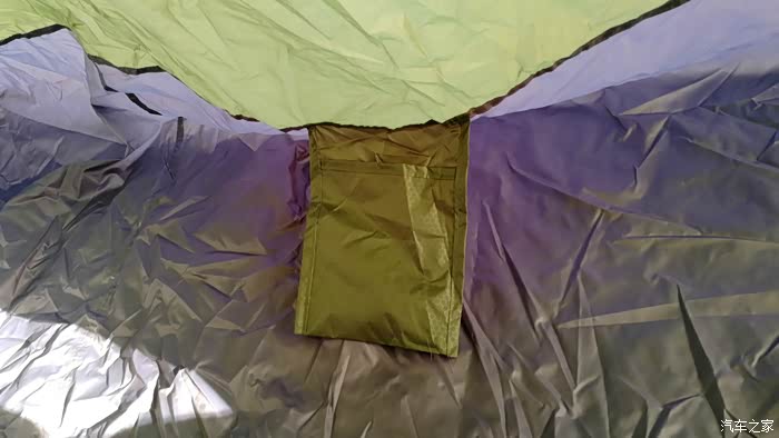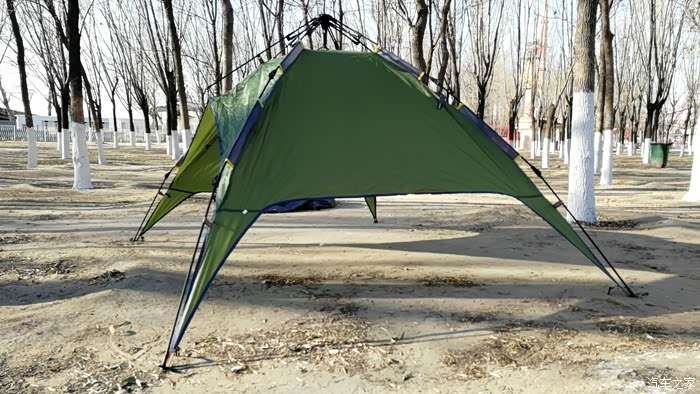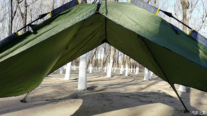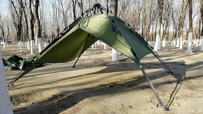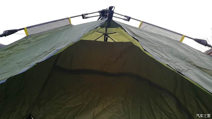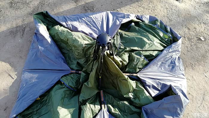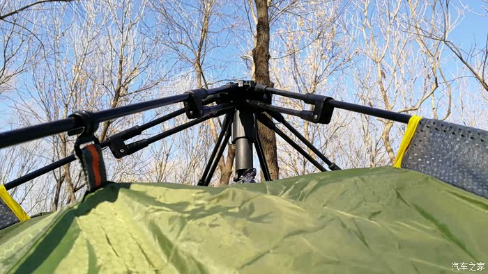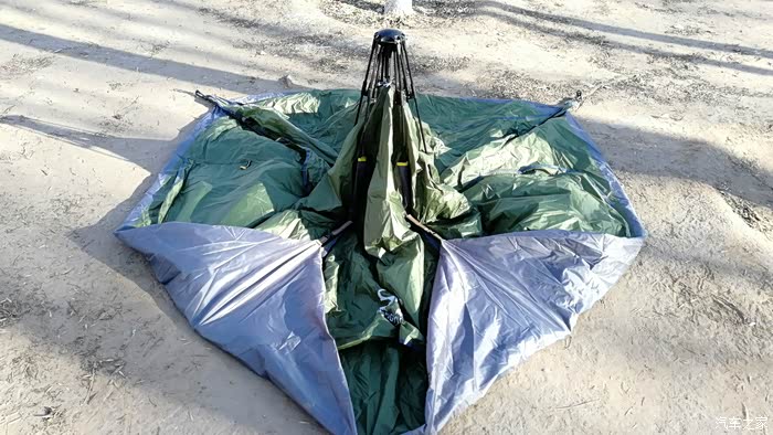 全部展开的样子,只要提着中间位置往上一提,帐篷很容易就打开了