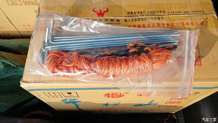 打开包装有帐篷和一个袋子,袋子里是防风绳以及地钉
