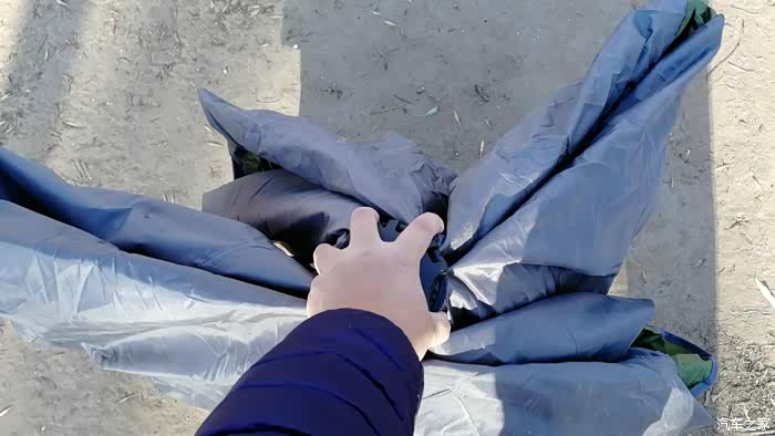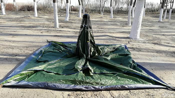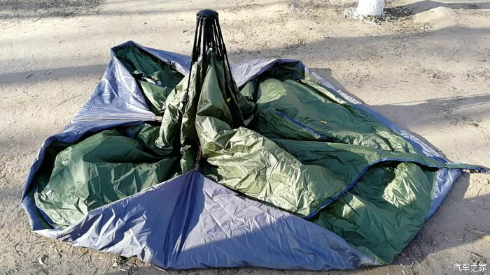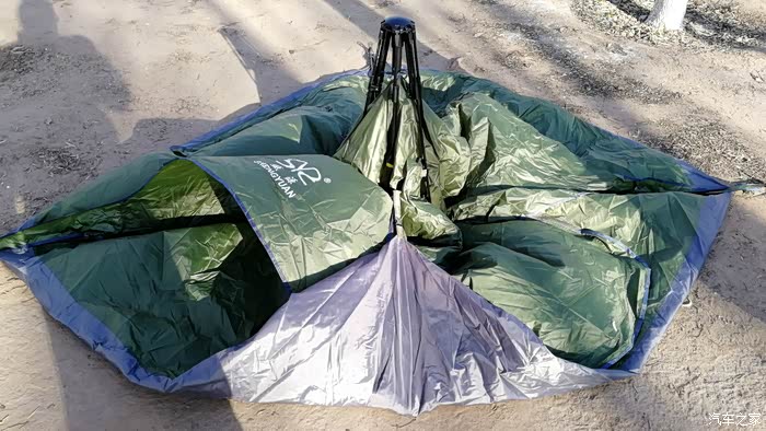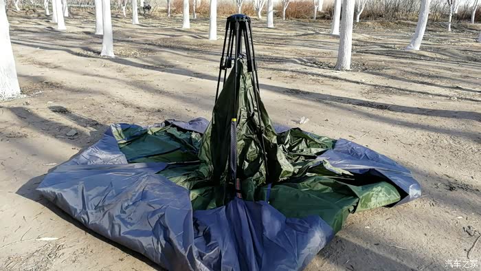 把帐篷从袋子里拿出来铺展开,四条腿还是折着的,这就需要一一展开