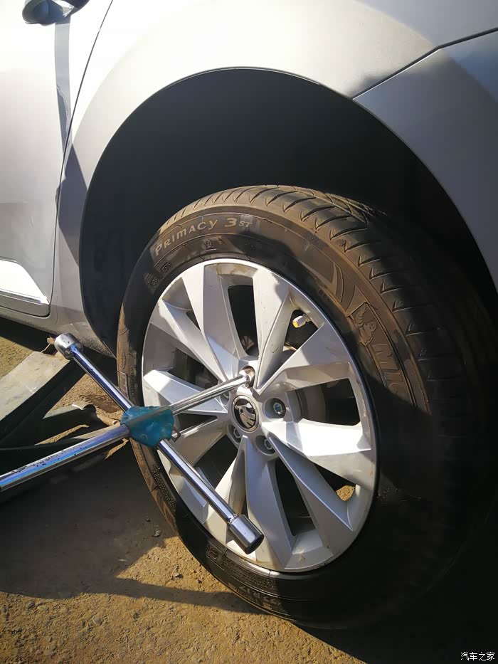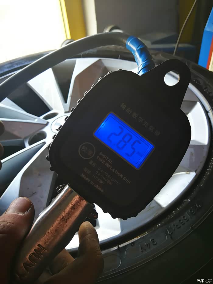 安装完第二个轮胎时测到的胎压是2.85,胎压监测主机上面显示的是2.9,基本上一样。