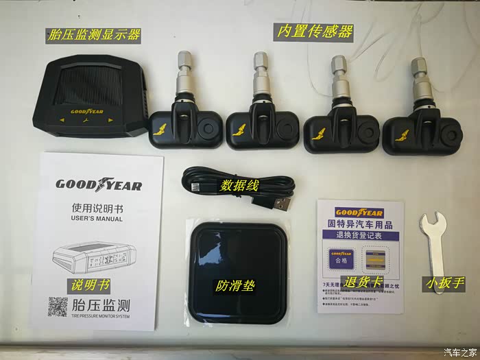 尽管我的车本身是有胎压监测的,但是我的车的胎压监测是被动式的胎压监测,工作原理是轮胎监控报警系统利用ABS系统传感器传送的数据监控各车轮的转速及其滚动周长的变化状况。若某个车轮的滚动周长发生变化,报警灯将点亮。被动的胎压监测不能够实时的的显示目前的胎压,只有胎压有变化的时候才会报警,但报警的时候可能已经行驶了一段距离。所以加装了实时能够显示胎压数值的固特异胎压监测就能够随时掌握轮胎的情况,包括胎压温度,各个轮胎的胎压不同时也能够及时调整。