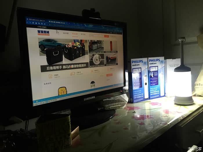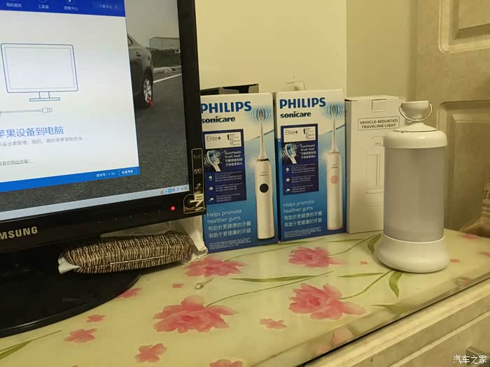 显示器旁边,上面所提到的2支飞利浦情侣电动牙刷(某宝卖300多一支)一直没舍得使用呢