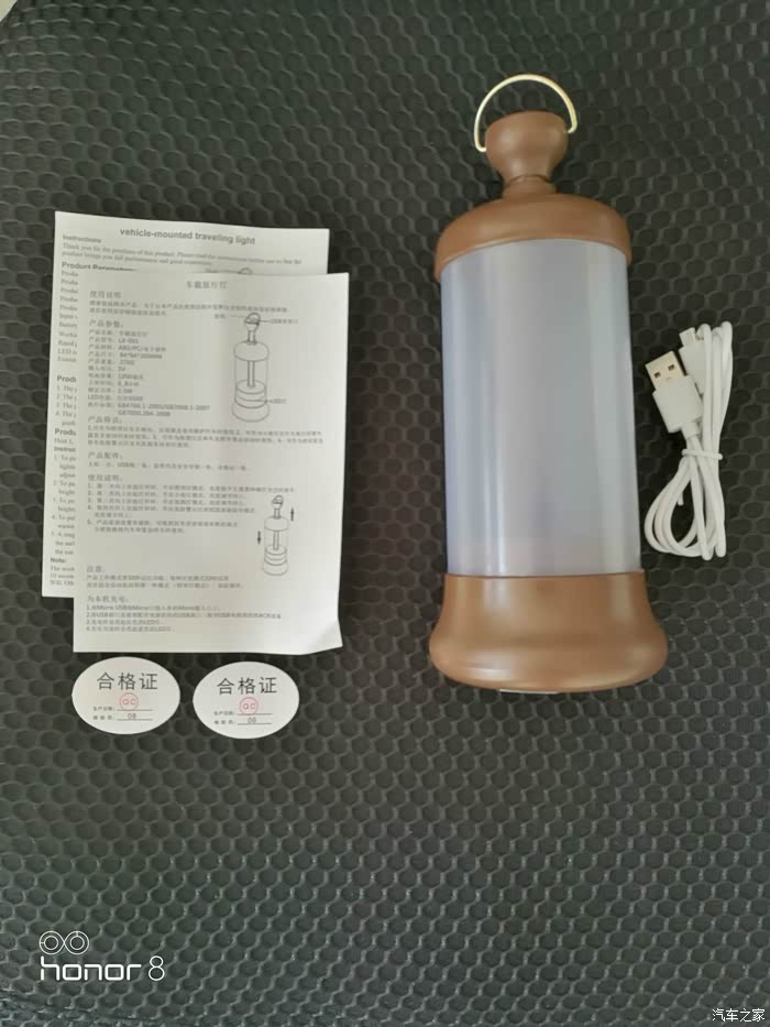 开封!三件套:使用说明书和合格证;灯体;USB充电线(输入电压5V)
