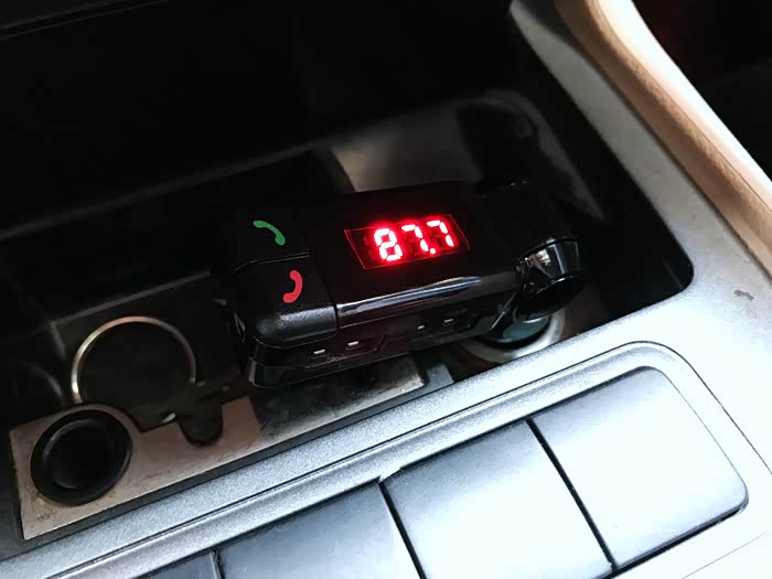 将机器插进车的点烟器接口上,非常轻松,一点不适感没有,这个说明产品和点烟器的连接很准确,不是那种非常紧或者松的感觉。插上以后,打开开关,显示屏会自动显示出射频频率,用于发射射频信号投射到车载音响上。