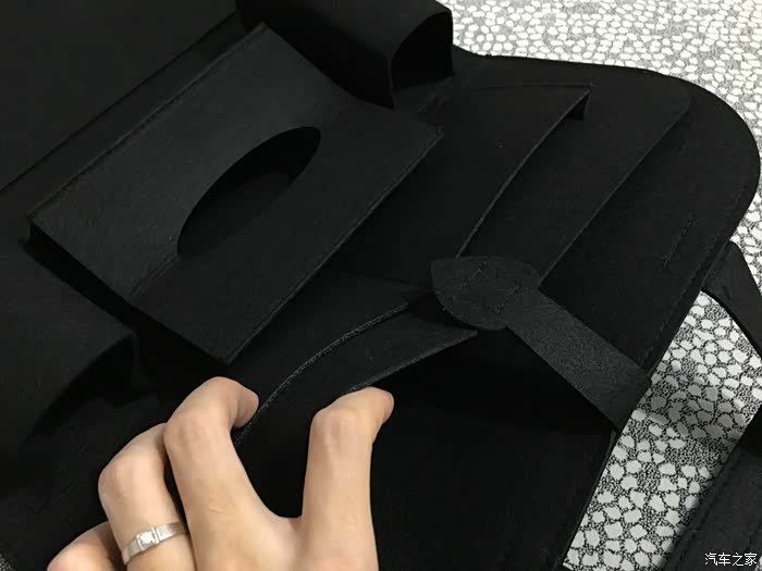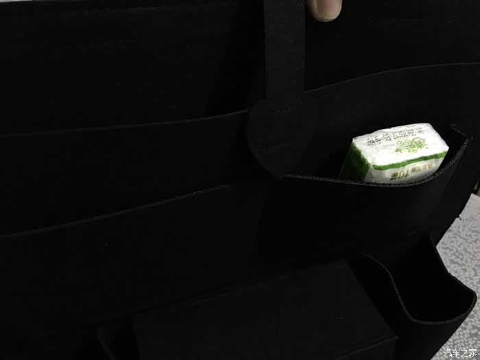 接下来我们来看看材质,这款储物袋用的是毛毡材料,挺厚的手感不错,不容易变形,质地适中,不软不硬,这种材质放在座椅后面,即使在发生紧急状况时也不会对后排的乘客造成伤害,这点很好。
