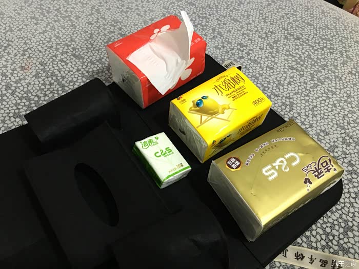 下面测试下这款储物袋的容量,我采用了四种不同的纸巾,这样方便各位通过实物感知下它的储物能力。