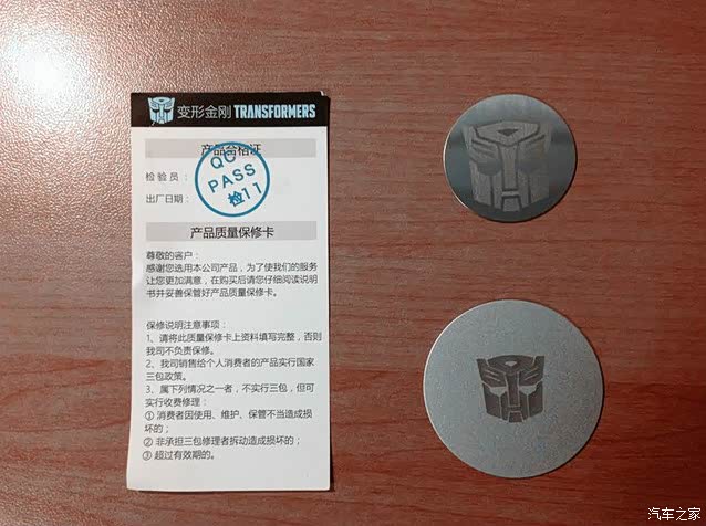 附件清单,产品合格证和两片带有变形金刚头标的磁吸片。