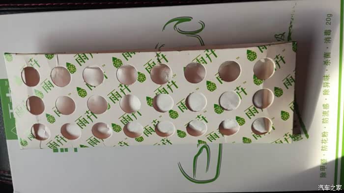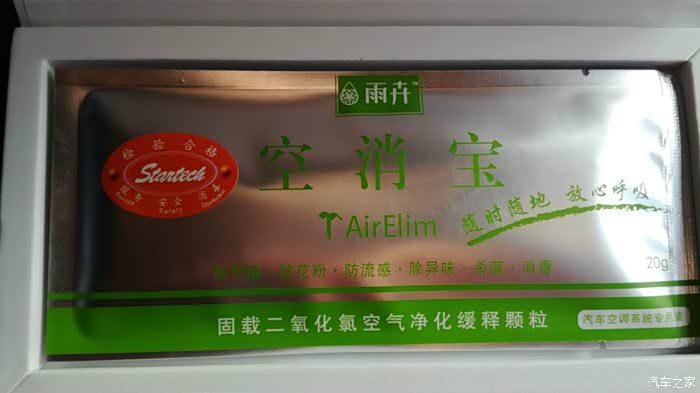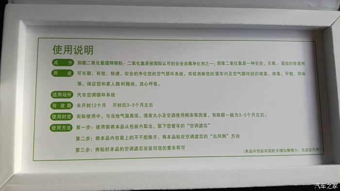 先来介绍下今天的产品吧,空消宝,是不是这么一说,比较高大上的感觉啊,这是一款固载而氧化氯为主体的缓释颗粒,看说明介绍说二氧化氯被国际认可安全消毒净化剂之一,是一种安全且无毒高效的除菌剂,问了下度娘确实如此!那就开始我们的这次安装体验之旅吧,安装要先把自己爱车的空调滤芯拿下来,将空消宝安装在空调滤芯上,我爱车的空调滤芯在手套箱里边,需要拆卸手套箱,有点麻烦,拆下手套箱更换上干净的空调滤芯,发现了一个问题,就是空消宝的双面胶无法粘在空调滤芯上,自己研究了一下,发现安装上空调滤芯之后,会有一个小逢,勉强可以把空消宝塞上,建议完善车型的匹配度或者弄成挂在里边的,这样觉得太不方便和操作,安装完毕后,开车出去体验了一下,因为没有专用的测试仪所以短时间根据肉眼和嗅觉是无法分辨和出他的效果好坏的,不过打开空调之后,确实感觉比安装之前要好了,不知道是心理问题还是更换了空调滤芯的原因,当然了具体的效果需要长时间的验证,所以也建议官方能够带个小小的检测仪就更加完美了!