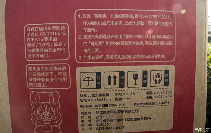 侧面有简易安装说明和微信公众号的二维码,扫描二维码可以进入“感恩安全座椅”公众号。