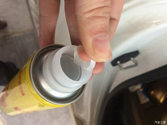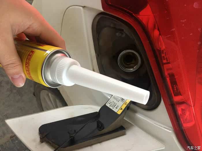 插入加油口。倒完一整瓶。按油箱容积跟添加剂的比例,55L:300ML差不多0.5%的比例。