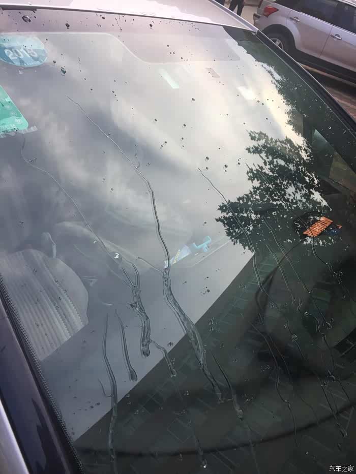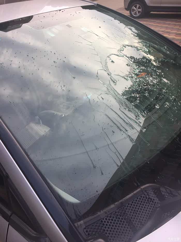 雨水在风挡上面形成水滴,不开雨刷,不影响视线。