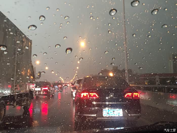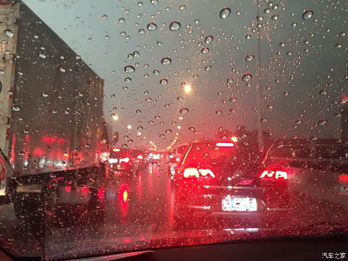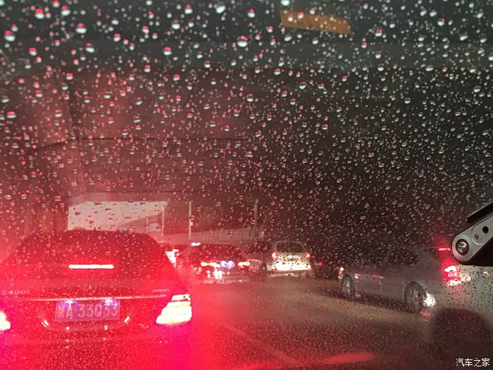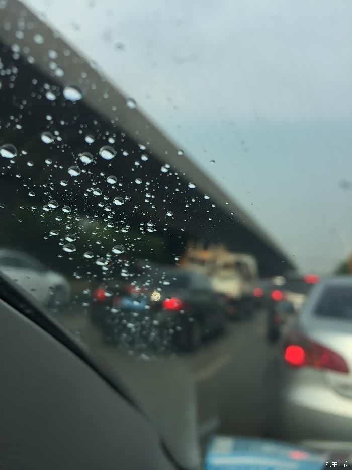 雨不大,比毛毛雨大一点点,这时候感觉水滴在风挡上面形成的比较多,由于堵车,车辆停止不动,感觉上稍微视线不好,但还在可以看清路面的情况之内。
