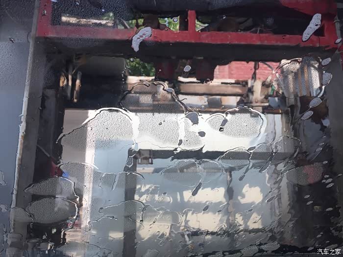 从洗车店里出来,堵车,正好风挡上面左角上没有擦到位,清晰看见水形成一个个的小水珠。