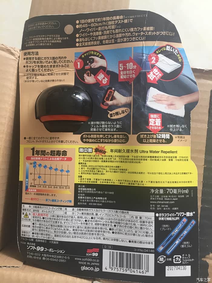 最后总结一下:首先这个收到快递以后,发现整体包装不错;其次:开箱以后,雨敌的做工,手感,细节都处理的不错;再其次是使用方便;最后就是效果了,按说明书解释,这样雨敌能保持一年的效果,这个没办法评论,毕竟才到手几天。使用后,泼水后,水顺着风挡往下流,最后就剩下小水珠,今天上午洗车后,风挡上面打了泡沫(应该是清洗剂),后来冲洗后,风挡上面也是留下小水滴。下午下雨了出去,雨敌丝毫没有因上午洗车打泡沫而影响效果,就是在毛毛雨的时候,在风挡上面形成的水珠较多,有点影响视线,但随着雨的加大,小水珠合并成大水珠,然后迅速的滑落,基本上不影响视线,雨变成大雨后,风挡上面基本上水珠保持一个稳定的密度,不多也不少,我认为不影响视线,出去在雨中跑了近20公里,在环路上,赶上下班时间,堵车,一直没有使用雨刷,有一段路车速跑到60,居然比低速时的视线还好,水滴合并后往上走,视线更加清晰。到家后停车,打开雨刷试试,一下,只一下,风挡上面就干干净净,跟没有下雨一样。并且,雨刷在风挡上面运行很丝滑,没有以前咯嘣蹦的声音了。