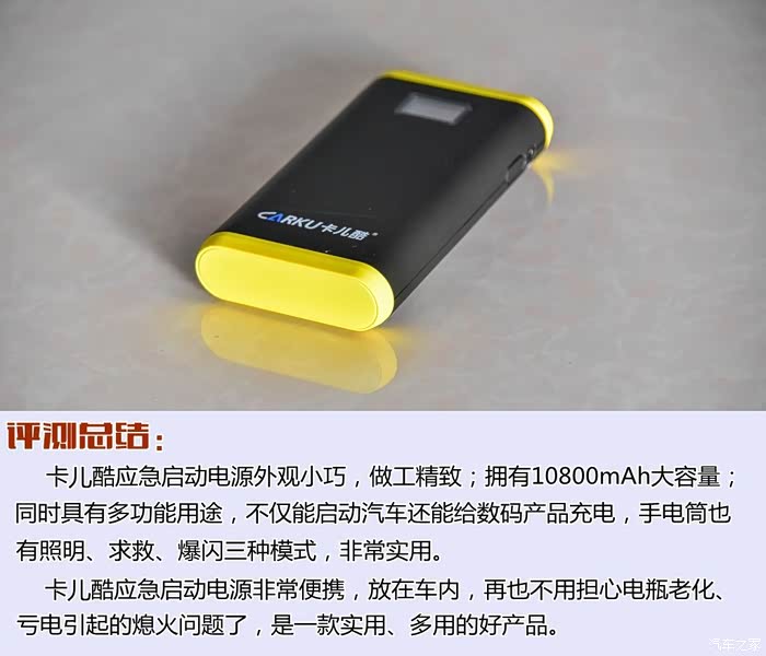 通过这次体验,卡尔酷作为启动电源功能上是没有问题的,结合其他方面整体的表现是不错的。希望提高充电速度、增大容量、电量显示的准确性上做一些改进。