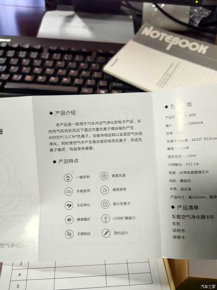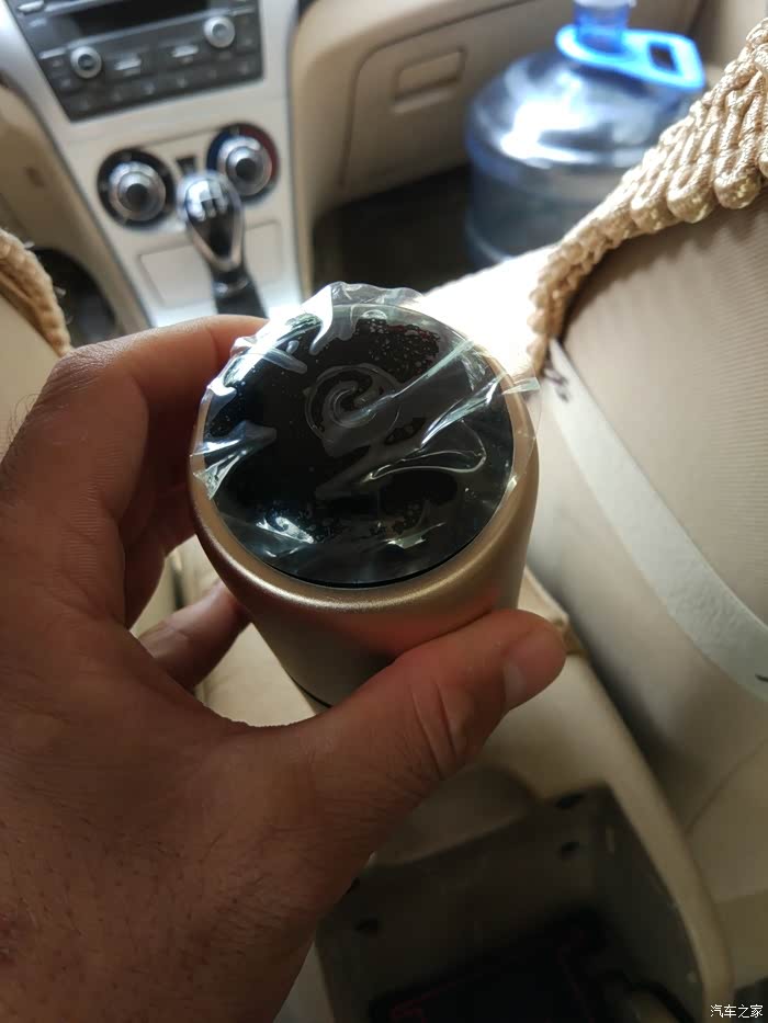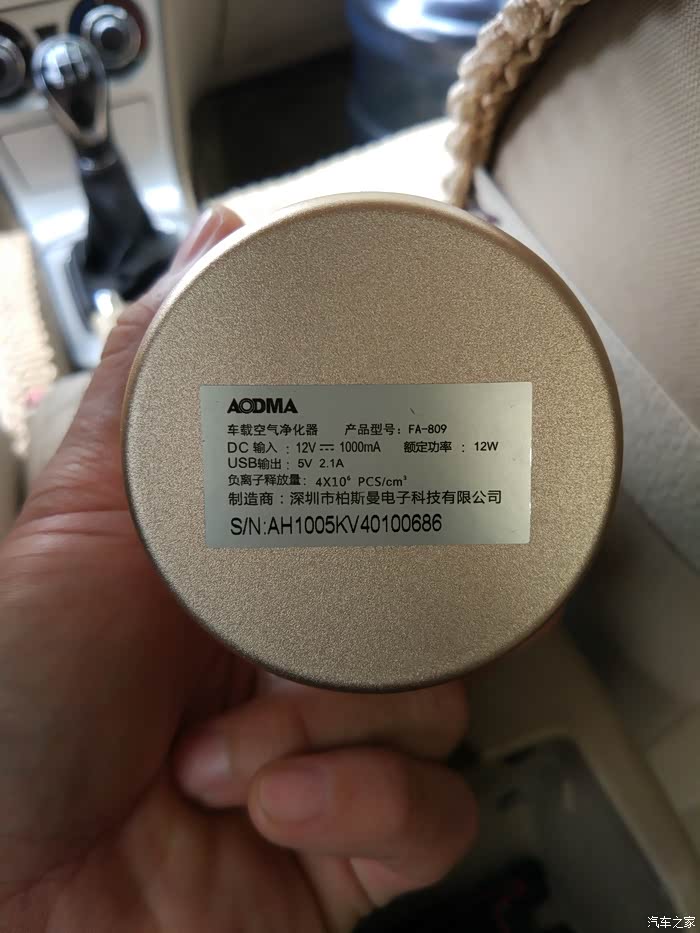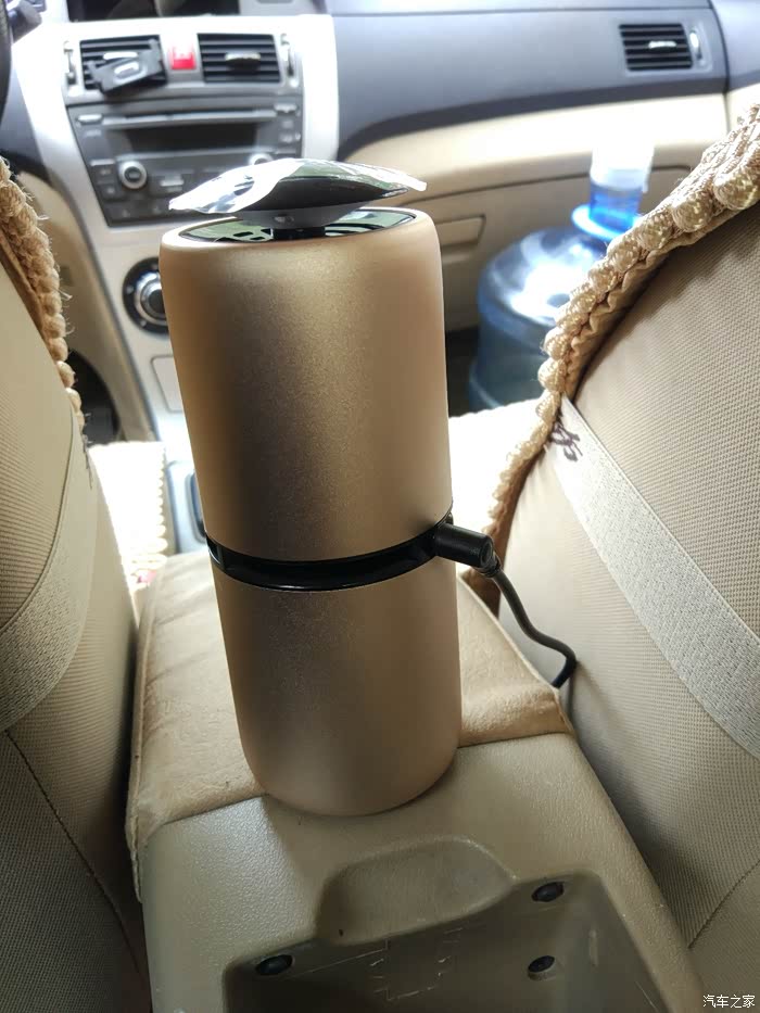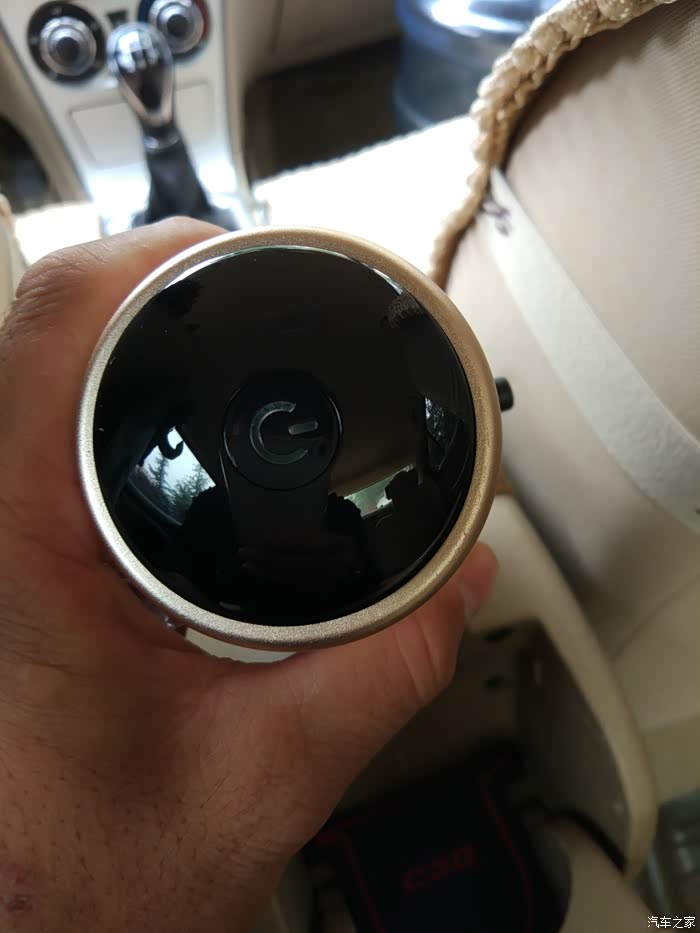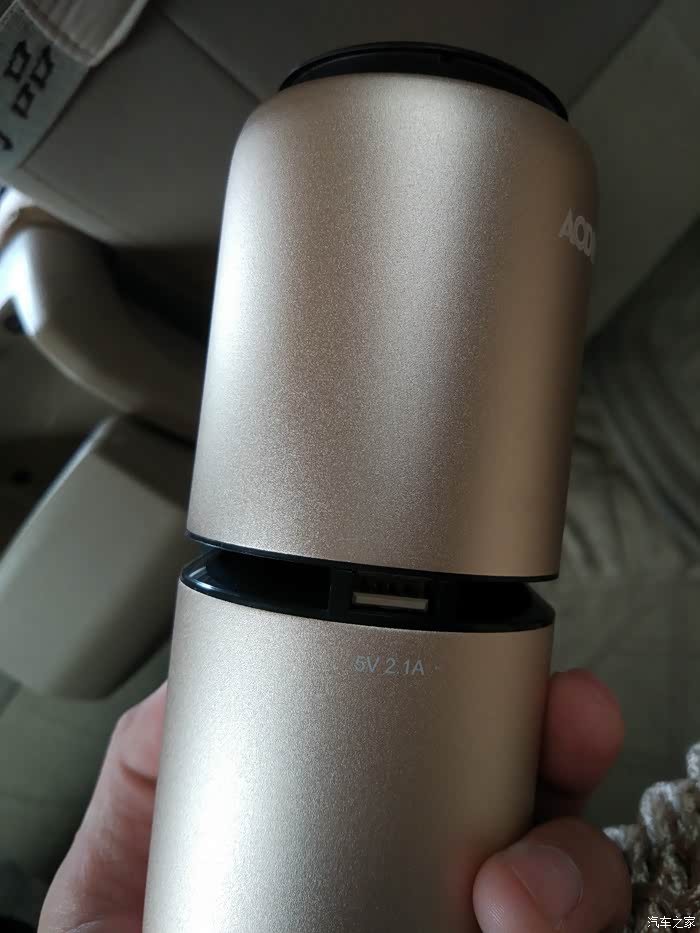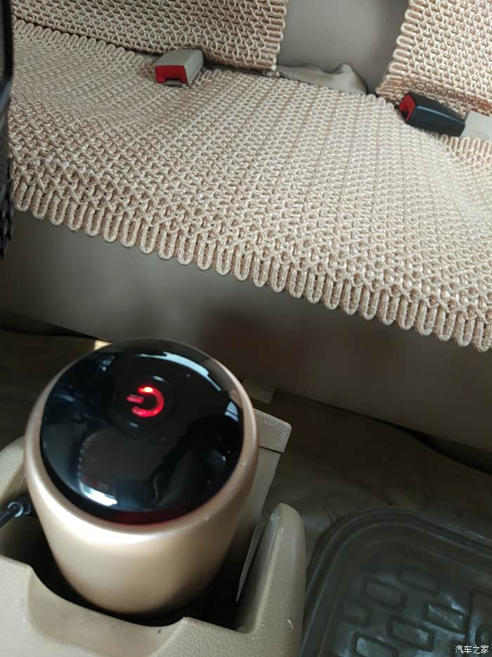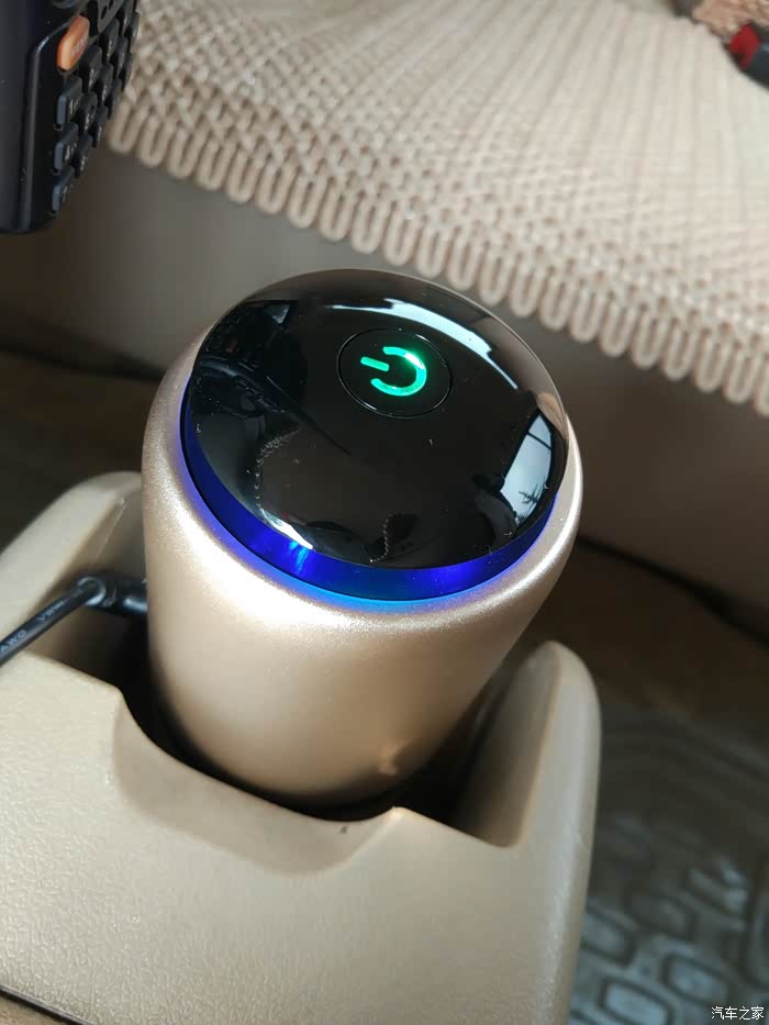 最后总结一下:摁下红色指示灯之后就会开始释放负离子净化车内的空气,这个净化杯开启后声音不是很大,相应的出风量也很小,两边的USB输出口我已经用它充过电了,充电器跟手机充电器一样的速度,在这个我们越来越机不离手的时代而且电量越来越不够用的时代这个设计真的是太好了,我把净化杯放在这里前后排都能感受到,而且后排乘客还能为手机充电,赞;还有几点要说一下这个小口的电源插口能否换一下,换成我们手机用的那种Micro USB或者Type C的也行,这样是不是可以大众化,还有就是只能在车上插点烟器取电用,我费尽心思找了另一端是USB的电源线,想插上充电宝为他供电持续净化,可是净化杯工作了没有一分钟就自己停止了,好像是功率达不到,所以如果可以的话建议能用充电宝之类的为他在不用汽车电瓶汽车不打火的情况下可以持续净化,这样就不会造成车辆电瓶馈电和汽车怠速的燃油消耗了,好了我对这款车载空气净化杯大致的感受就是这些,有什么不足之处请大家指出,谢谢。