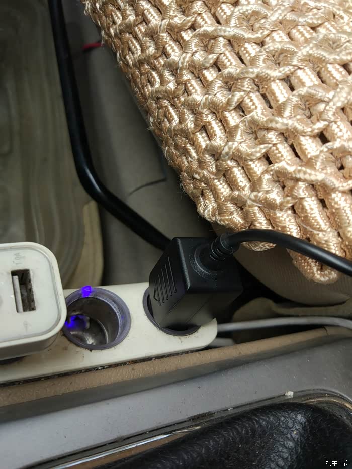 电源插头插在一拖三电源上,整个车载空气净化杯才12W的功率,所以在这个一拖三上使用足矣