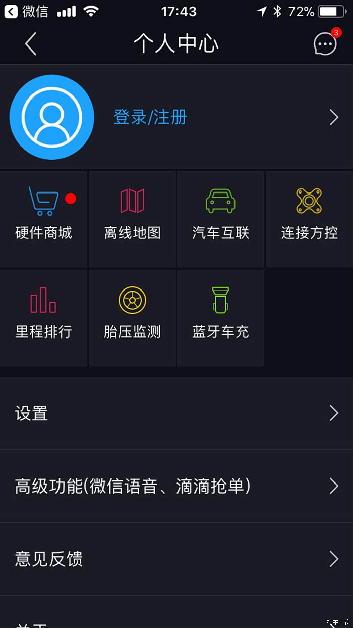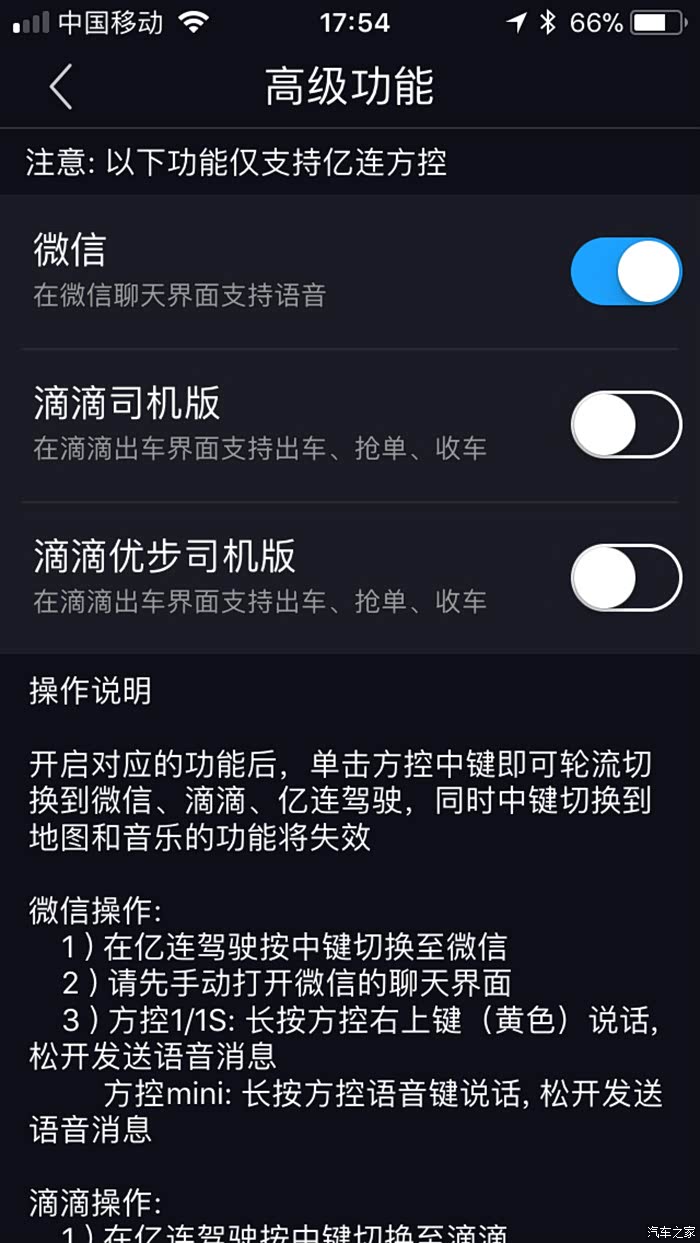 高级功能里还支持微信和滴滴。微信支持语音聊天,滴滴支持出车、抢单及收车。