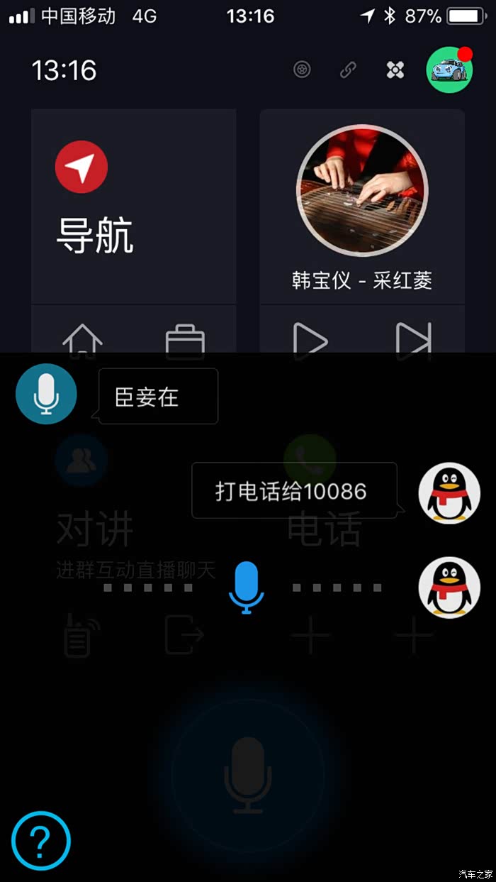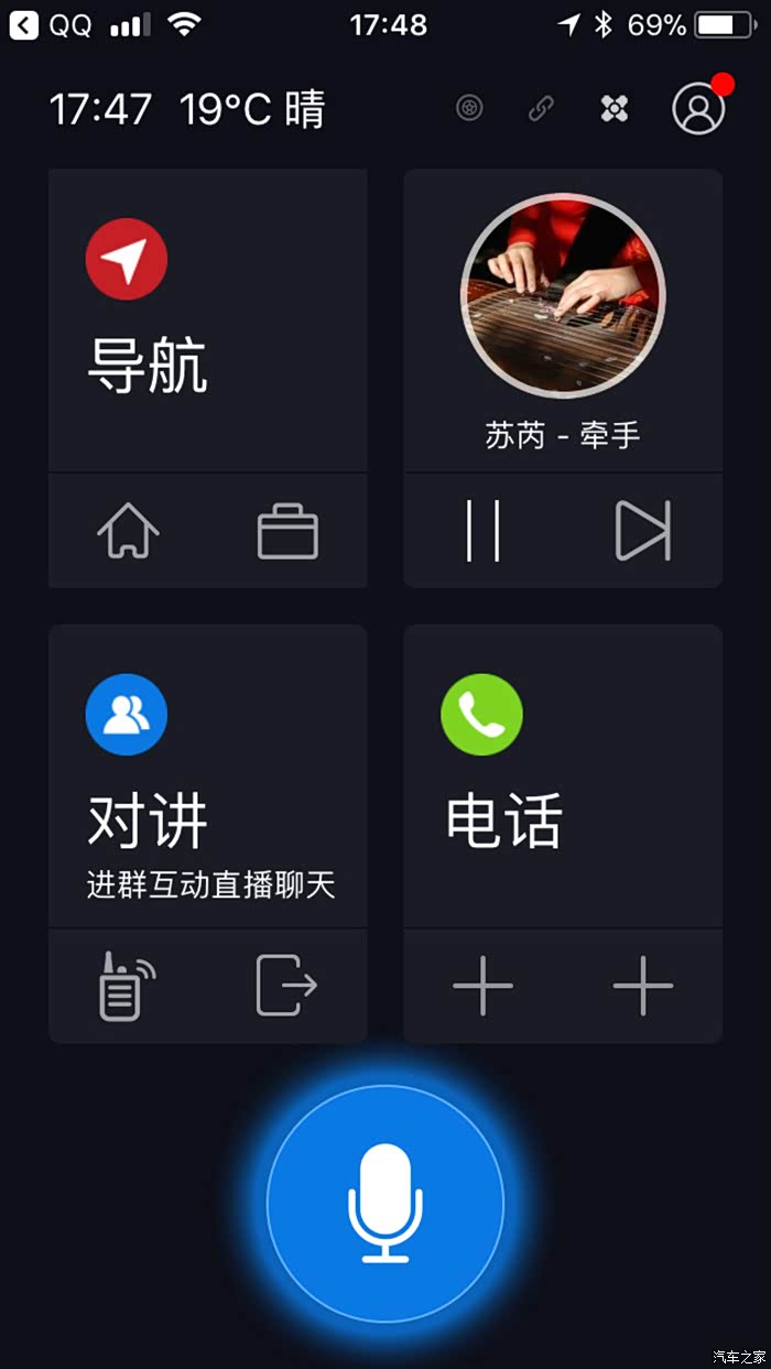 打开后主界面显示导航、音乐、对讲及电话等功能。