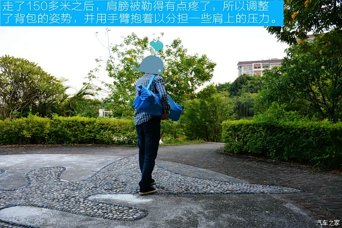同样的距离,因为身上的装备,最后用时三分三十四秒,多了二十一秒钟。刚开始背着布袋的时候感觉很轻松,但后来没走多远,肩膀就有点被勒得疼了,所以这活儿最好还是男人干吧。