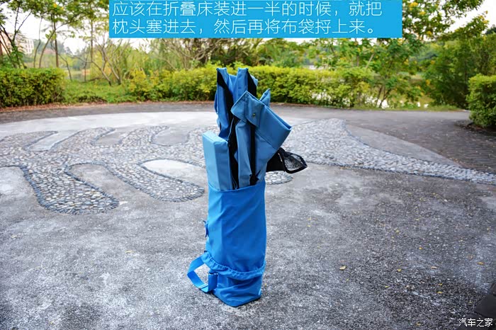 后来在将床装进去一半时塞枕头到布袋与床之间的间隙里去,再慢慢把布袋捋上来,就可以顺利完成收纳了!接着背起折叠床就离开,不愿再喂小蚊子了!