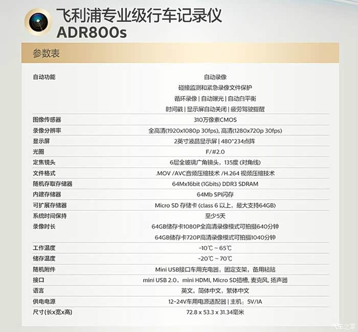 以上是一些飞利浦ADR800S的官方参数,大家可以参考一下。