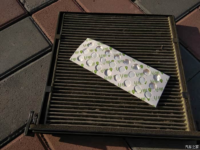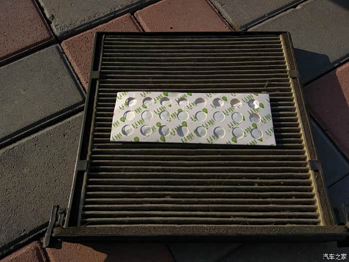 撕开包装上的不干胶,将空消宝粘在空调滤芯的“出风侧”方向
