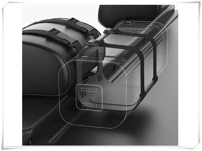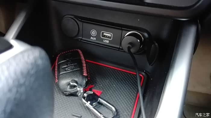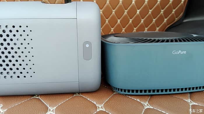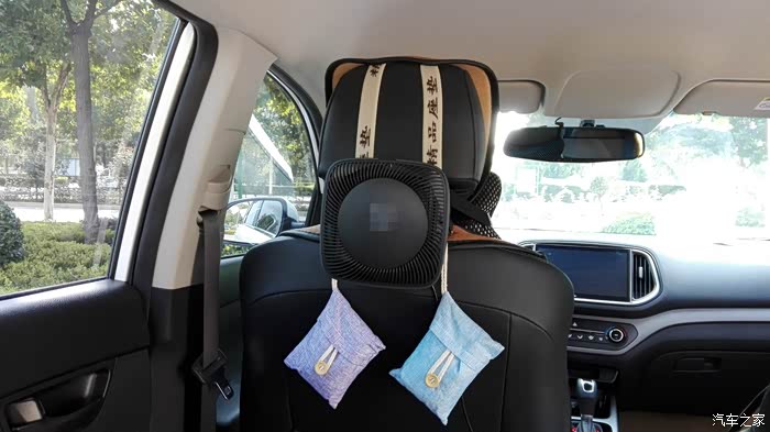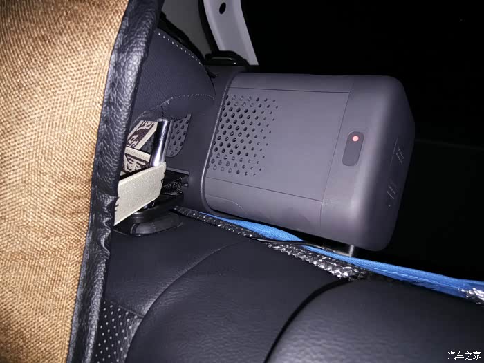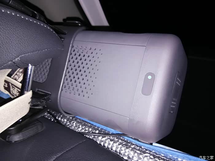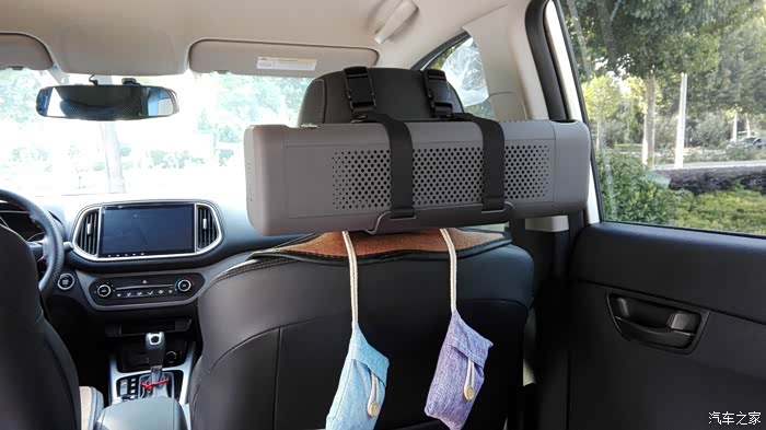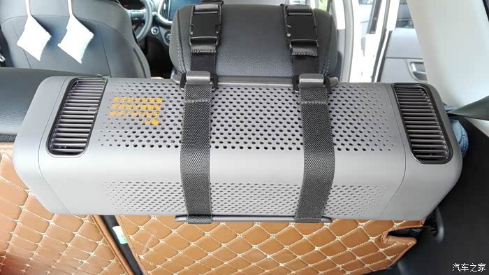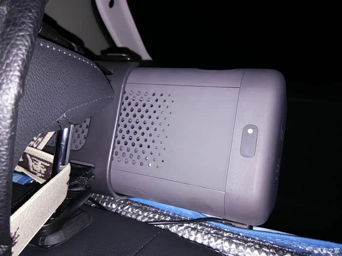 某品牌车载空气净化器安装在前排效果。还算可以不太影响后排乘坐。