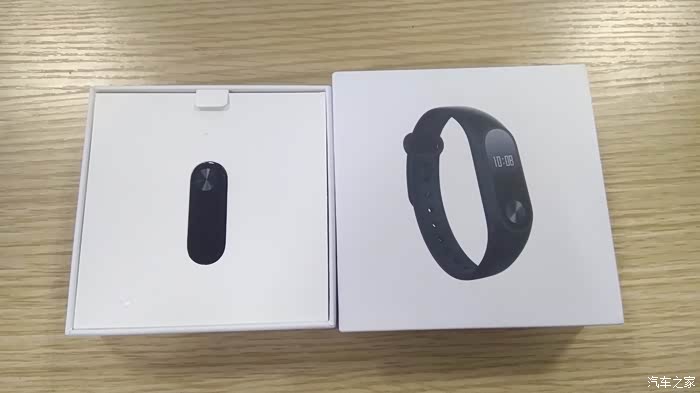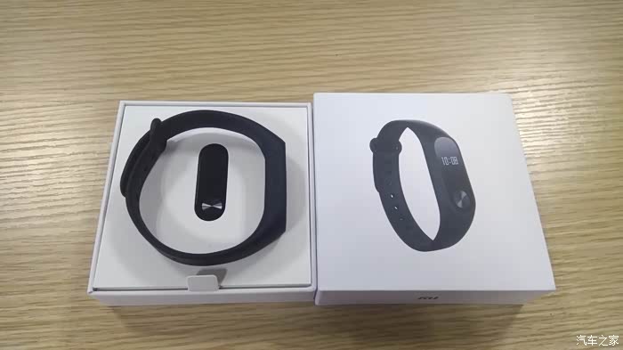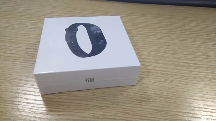 收到手环后拆开快递包装,露出手环的出厂包装,白盒子正面是黑色手环的图像,简约明了。