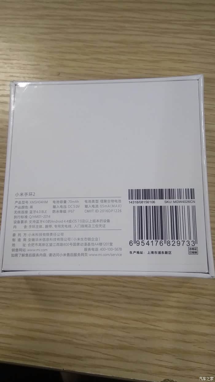 包装盒背面是手环的型号、容量等信息。