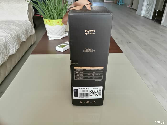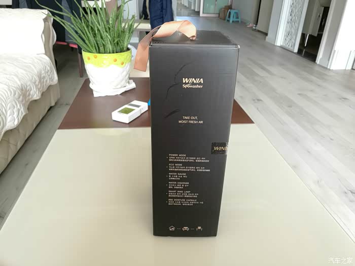 加湿杯包装盒全貌,为了拍照,我特意放在客厅茶几上。原来的东西都挪走,背景是浅色画面,以突出评测物体的可见性。