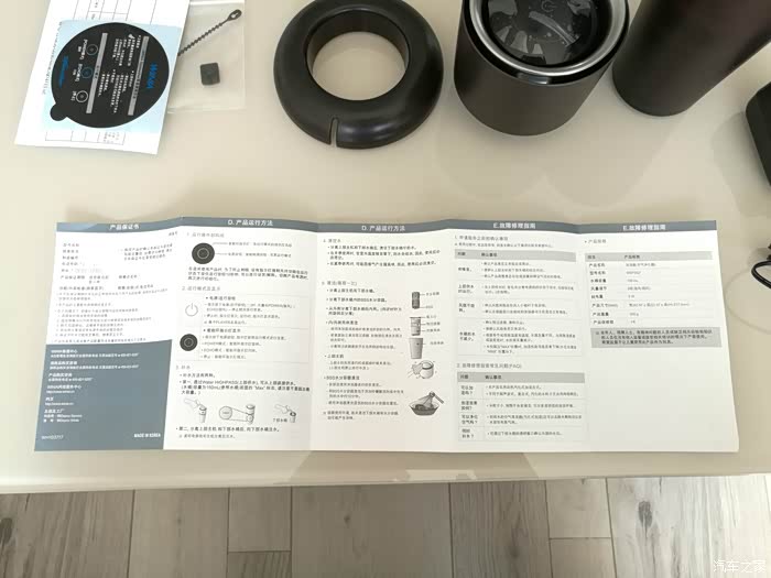 拆开包装盒看到内部情况,说明书保修卡,水杯实物和相关配件。