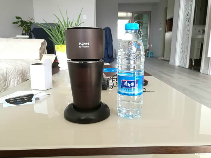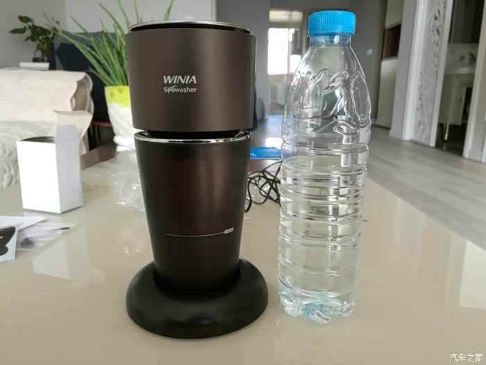 由于担心自来水有水垢,污染了滤芯,所以找了一瓶550ml装的康师傅纯净水作为加湿器的水源。同时也作为一个基本参照物,加湿器水杯加上底座置架还没有纯净水高。