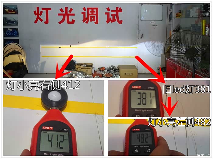 这是在改灯现场的测试,这组数据十分奇怪,右侧为换灯小亮后的数据,就是左侧更换灯泡前后,数据差非常大,根据这个数据,灯小亮的光照度比原先有很大提升,我考虑再三,和当时现场的环境有较大关系,场外干扰因素比较多,我设定照度仪只显示最大照度,可能拿在手上,对到了室外光线,482这个数值只能部分作为参考。