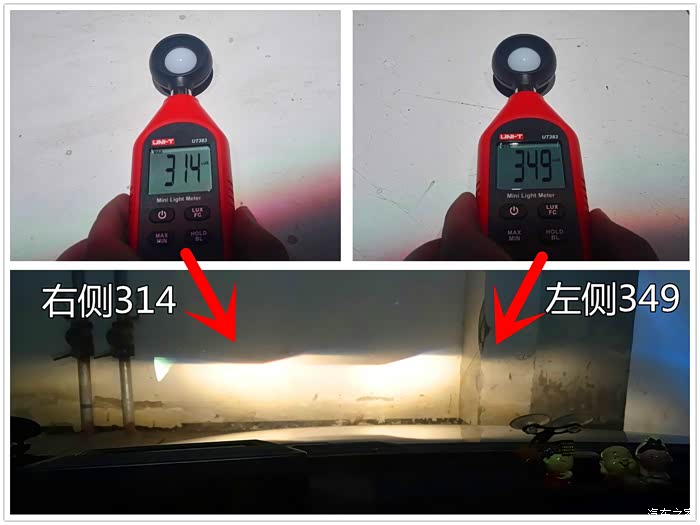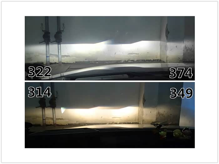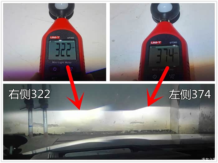 这是未安装灯小亮前拍的,拍摄完当晚出门,右前的灯就坏了。所以这个是原车唯一的对比数据。左右两边光差很大,本以为是光衰问题,经过后来测试,还有透镜引起的差别。