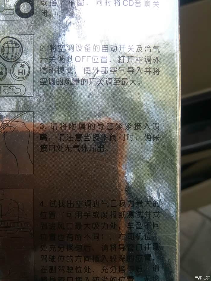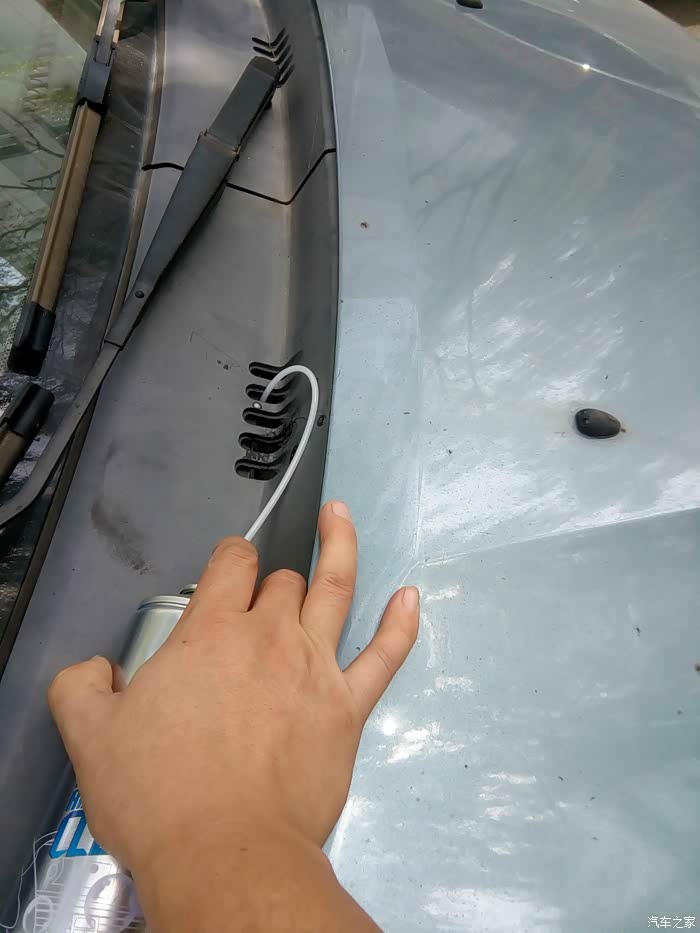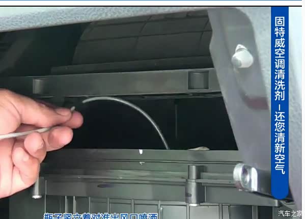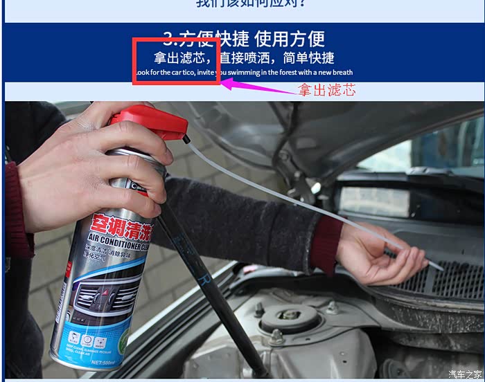 仔细看了一遍又一遍,的的确确没有要求摘掉空调滤芯,咱也就按照人家的建议,直接外循环进风口往里喷吧
