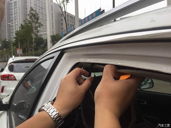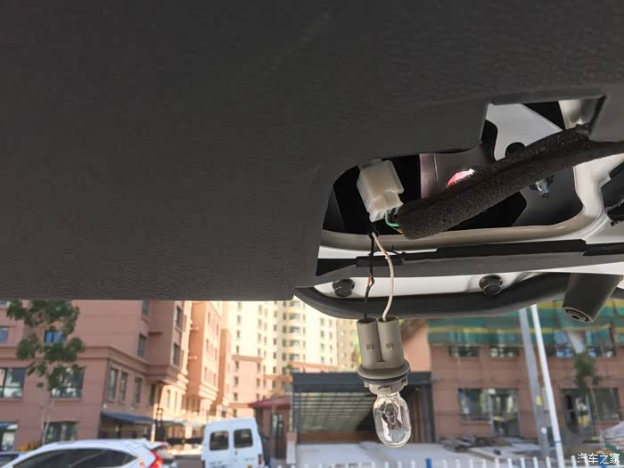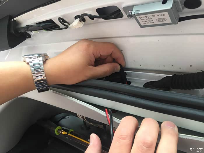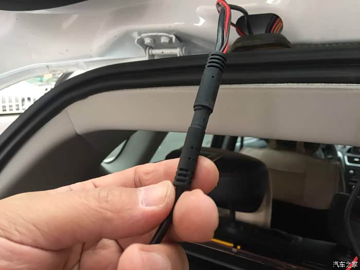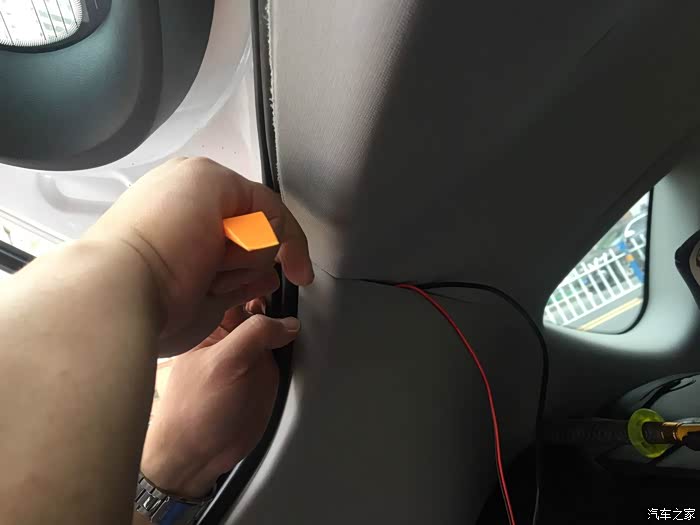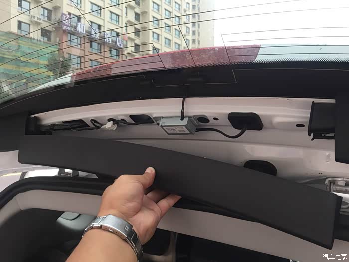 后镜头的线与镜头之间有接缝。怕淋雨,索性安装车内。先拆后窗护板吧。都是卡扣,找好位置,用塑料撬棒撬开的。