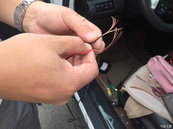 倒车灯取电,走线是个细活,软线走不过来,需要拆后门板。哥们为了不拆门板,用了自制的串线利器把线引过来,X80的倒车灯没有一点多余的线,把灯泡拧下来才这么点线。这里不用多少,破线接上就可以了,最好不要弄断,胶布缠严实了即可。