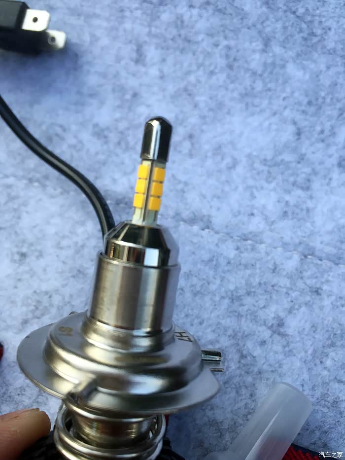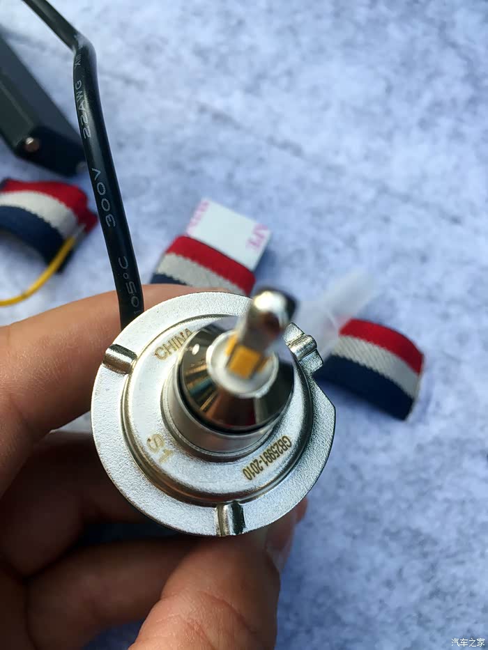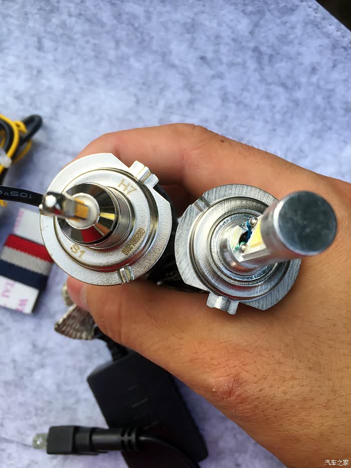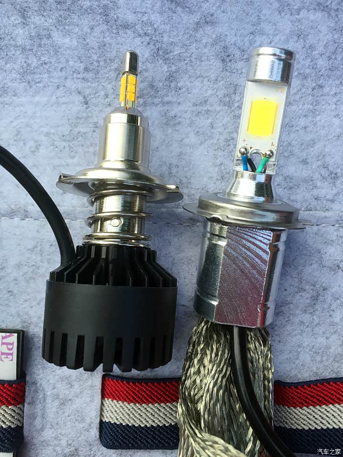 先是左边某牌的LED大灯灯泡,白的岔眼,