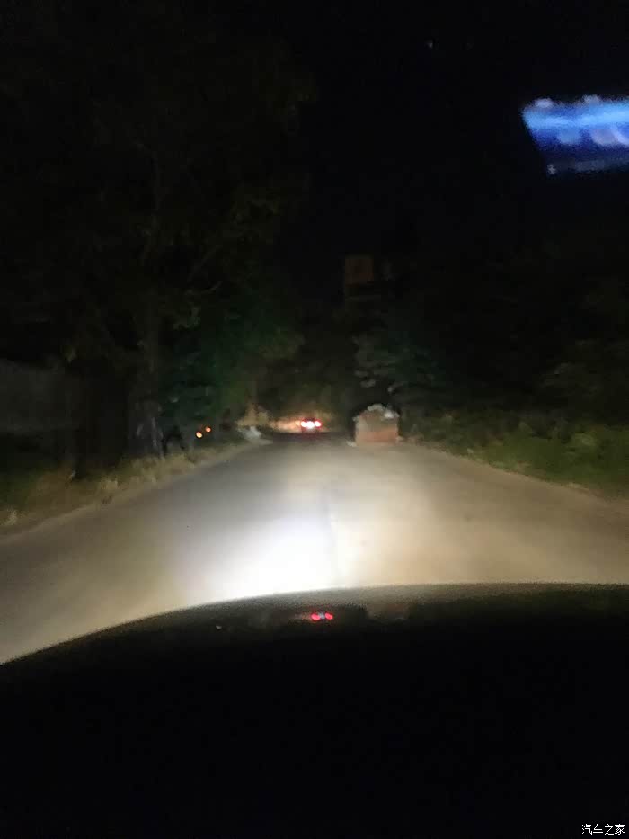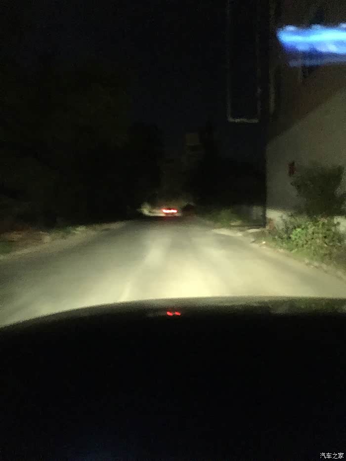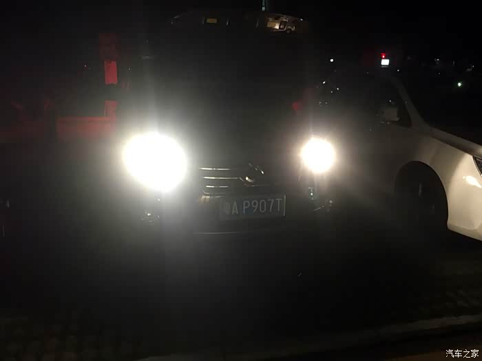夜晚时分,点亮远光灯,左边是灯小亮的LED大灯,4000K的色温与原车的相差不大。带有暖色