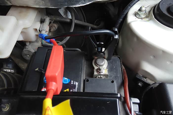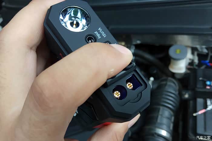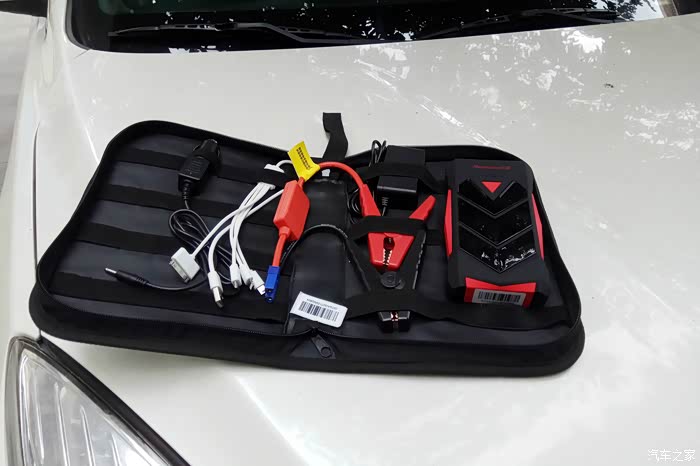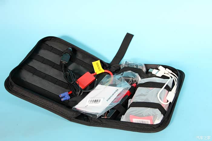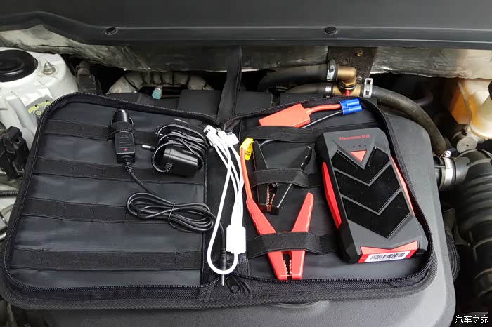 把便携包打开拿出连接线,这里需要注意的是要先连接电瓶正极,然后连接电瓶负极,连接好后再把链接插头插入启动宝的专用输出接口,然后再按下启动宝的电源开关,然后就可以进行点火了。