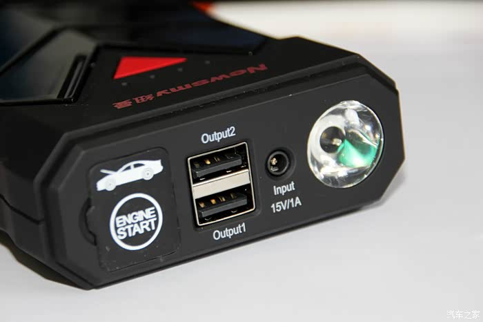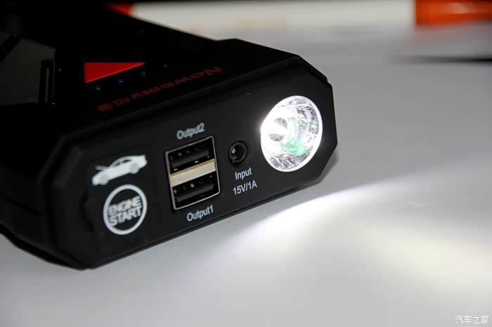功能面板,左边汽车标志的地方就是启动汽车连接线的插口部位,中间有两个USB输出接口,可以给手机这些充电,旁边小孔是给启动宝充电的输入接口,最右边的是LED高亮灯。
