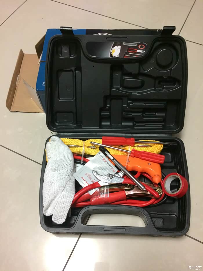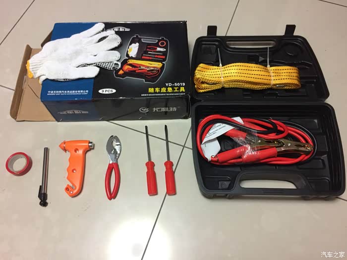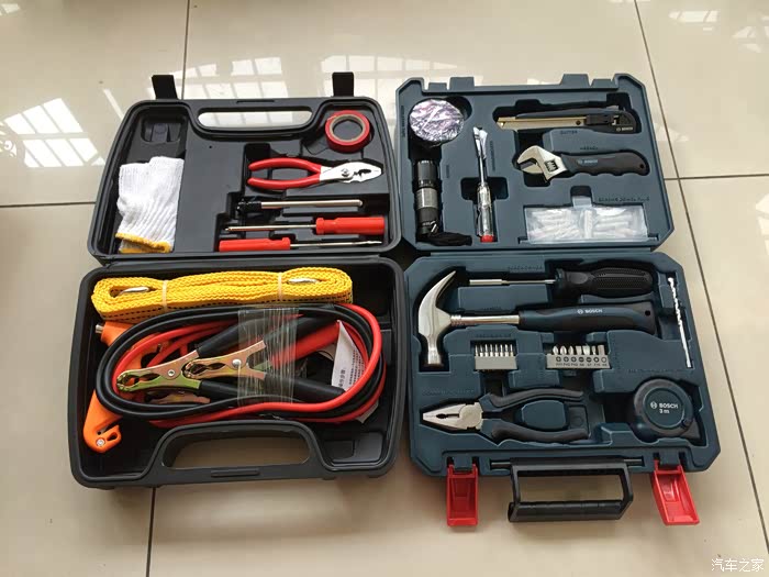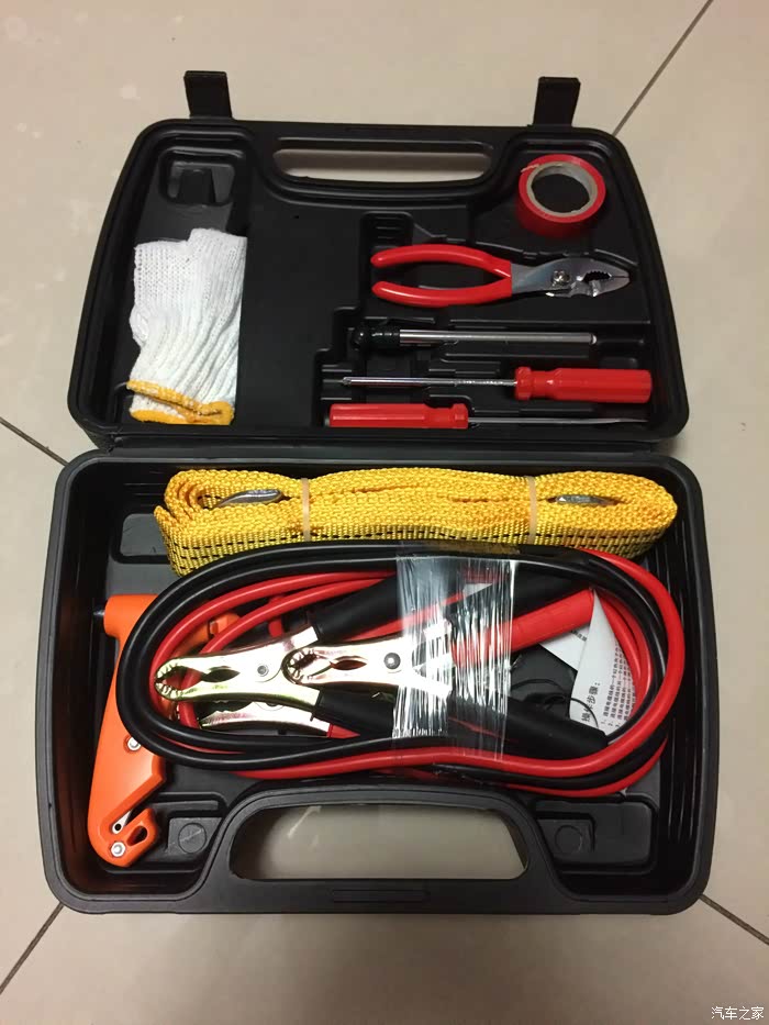 打开以后,感觉博世工具箱的布置更合理一点,每件工具都有固定,放在车上也不会出现异响,但尤利特车用工具箱就可能会有些异响,毕竟拖车绳、搭电线和安全锤没有固定,撞击到箱体的时候肯定会出现异响的。