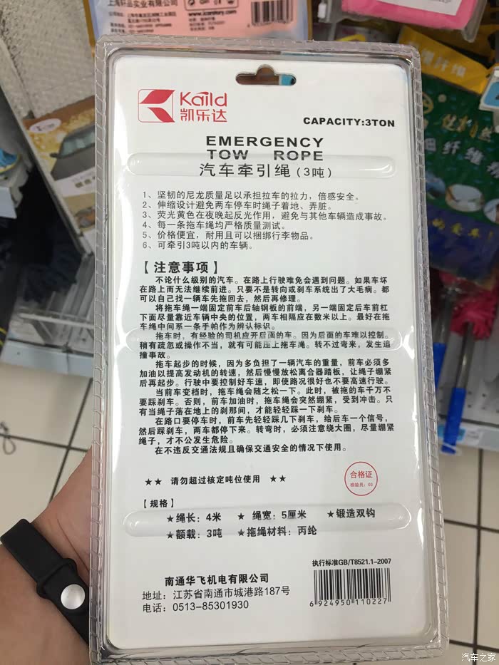 拖车绳的铭牌,还有注意事项,感觉还不错。