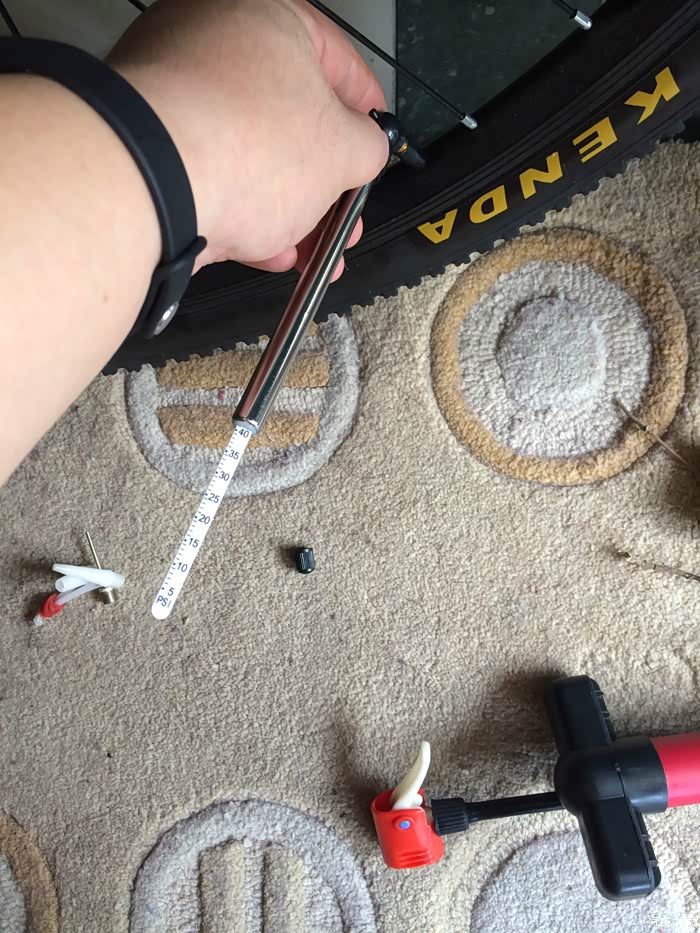 我的车在地下车库,哪里光线比较暗,不好拍照,所以只好拿它来测一下我新买的自行车的胎压了,还蛮好用的,往上一放,胎压值就出来了。
